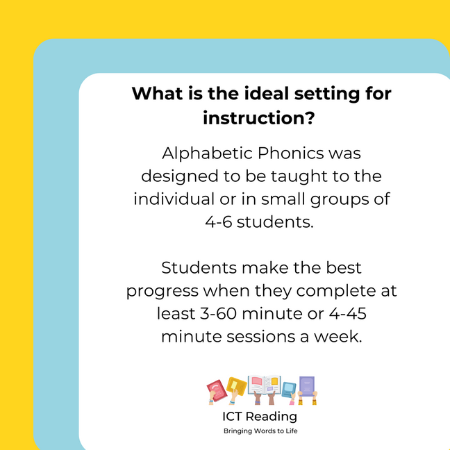 Alphabetic Phonics (AP) is a multi-sensory approach to reading instruction that can be taught to individuals or small groups of students. The program teaches reading, handwriting, spelling, verbal and written expression, and comprehension through visual, auditory, and kinesthetic learning.